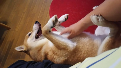 お腹をモフモフすると後脚で俺の腕をはねのけようとする柴男、この子柴犬に見えますよね?【再】