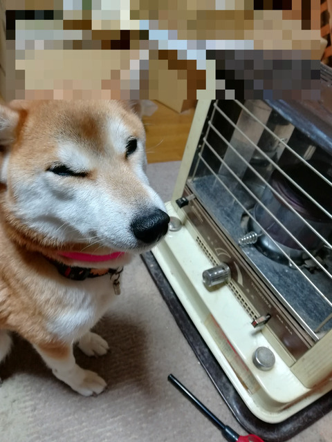 灯油ストーブ出力最小にしても張り付いてる柴子。【再】