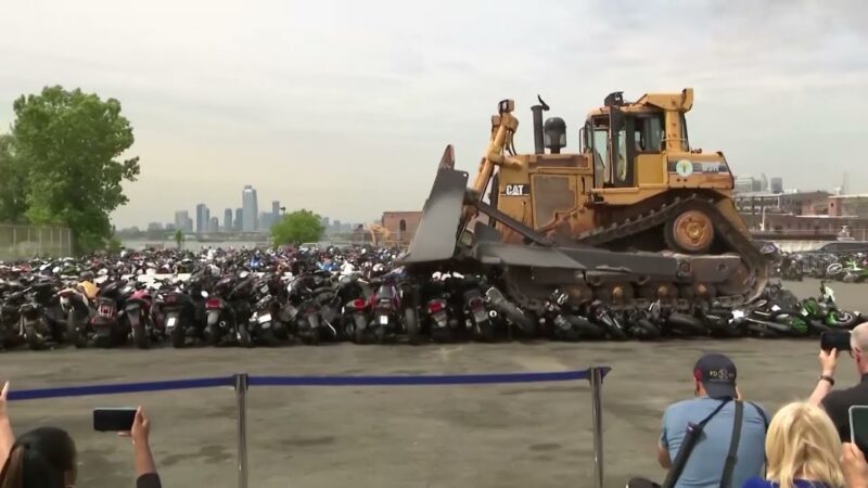 ニューヨーク市が没収した違法バイクを重機で一斉に破壊する瞬間!!