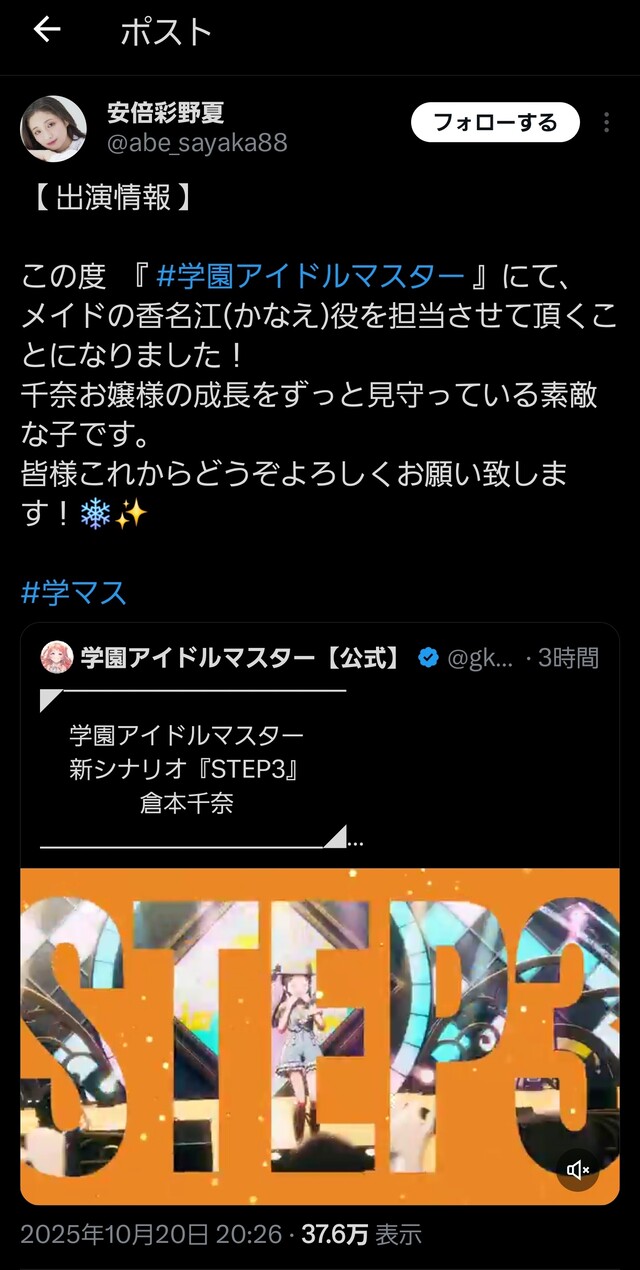 【学マス】倉崎千奈のメイド「香名江(かなえ)」実装!声優の名前が「安倍」で始まる