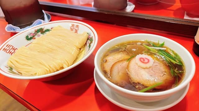 つけ麺の汁を右に置いて配膳するラーメン屋