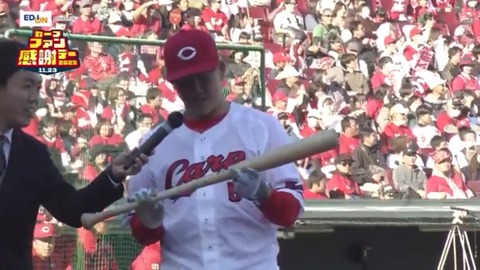 広島・小園海斗、笑顔でバウアーに蹴られたバットを披露、大事に残していた(広島・ファンフェス)