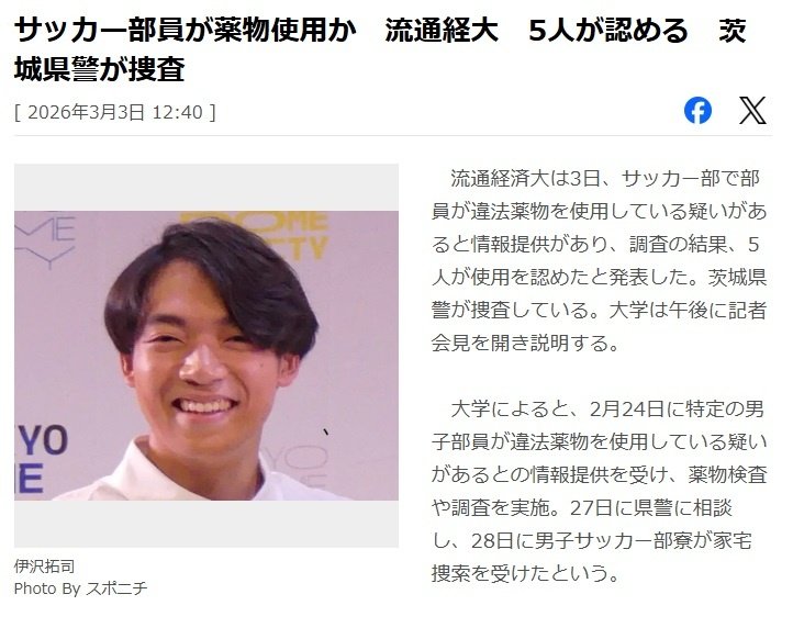 【速報】流通経済大サッカー部、まさかの薬物使用疑惑www茨城県警ガチ捜査中www