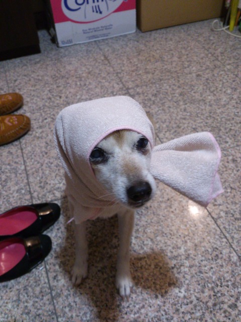どしゃぶりの日に一緒に散歩した後は身体を拭いてあげて最後にキュッとほっかむりしてあげてた。【再】