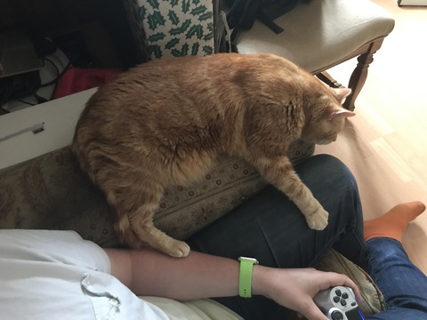 【ねこ画像】飼い主のそばでごろごろチャトラ、お外のクロにゃん、ソファでごろごろハチワレさ