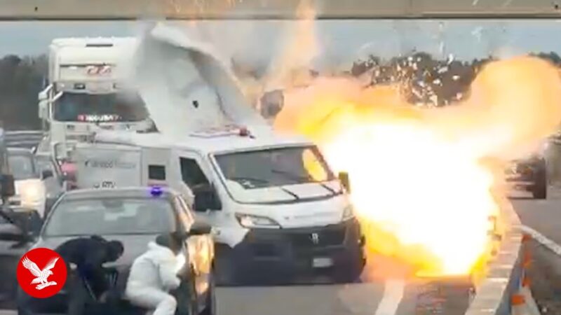 覆面の犯罪集団がイタリアの高速道路で装甲車を爆破してしまう!!